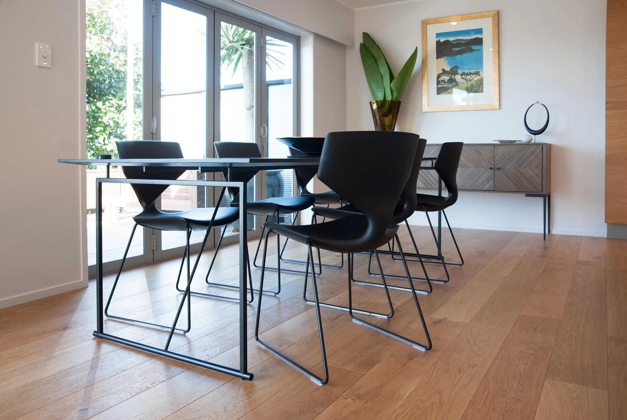 The furniture and furnishings were all selected and layered with care. The clever sofa with its sandy fabric and steel legs looks just as funky from the back as its front in this open plan space, finished with lush green and golden textured custom cushions. The handmade steel coffee table is refined yet still raw. The leather chairs can swivel to take in the full view or be part of the conversation. The black oak dining table is both sleek and industrial, paired with fun and super comfy Italian chairs. The hand carved console adds more texture and contrast. The master bedroom is finished in soft shell grey tones, including a subtly shimmering wallpaper, again with warm oak and crisp white accents. Ocean blues and a swimming koi (!) add a punch of colour.