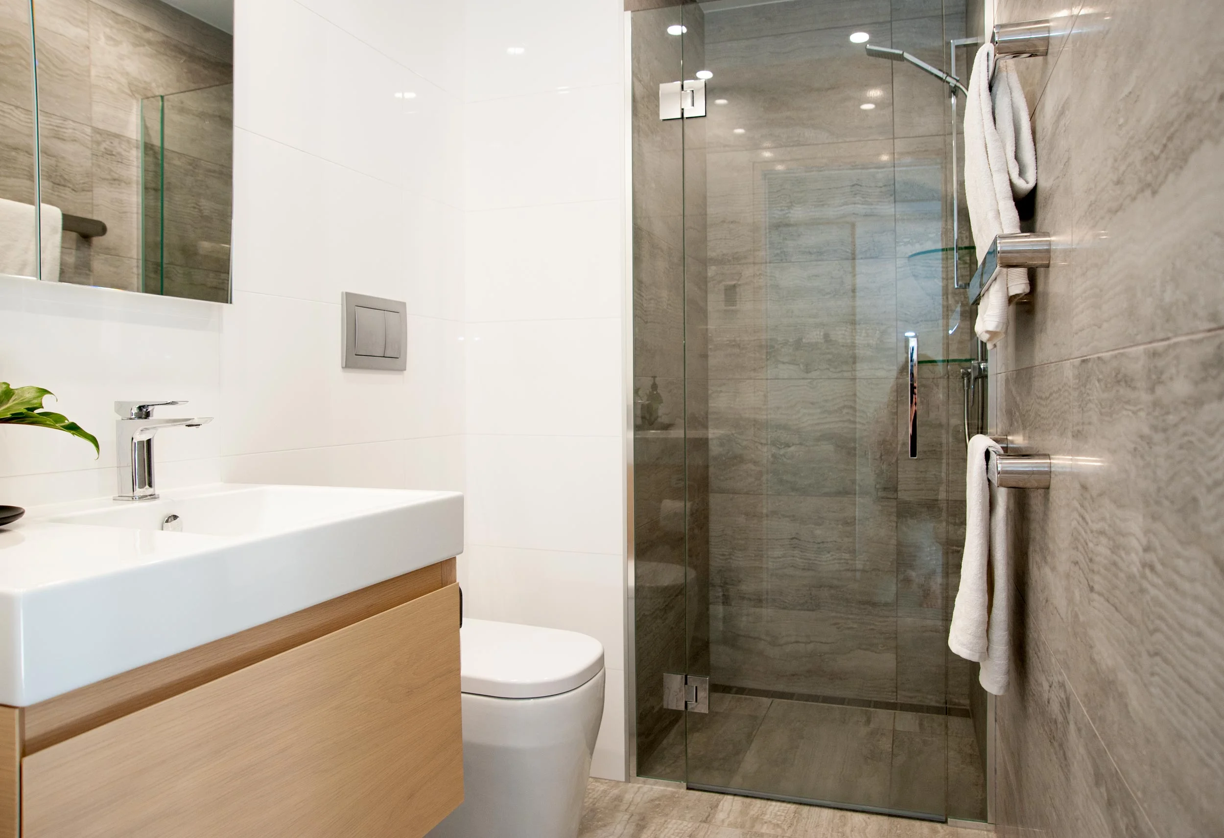 All the hard surfaces were chosen to be stylish but, above all, liveable. The Oak floors specified are engineered planks with a brushed surface finished in a matte lacquer - this gives fantastic texture but also provides a highly durable scratch-resistant surface. A pelmet was added above the wall to wall sliders to hide motorised blinds which lower to preset options at the touch of a button. A feature wall was created in the living room from the same grey stone kitchen splashback tile - this darker colour effectively hides the television but also creates visual flow between these open plan spaces. The ensuite finishes continue the visual story - textured grey tiles, warm oak, offset with crisp white.